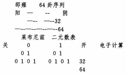 由于量子学在粒子领域的进展,发现“一切物质的最基本结构是对隅的,每一粒子就有反粒子,两者体积相似但电荷正负相反。”“一切物质只由两类粒子所构成。”这是万事万物存在发展的普遍现象。阴阳交互作用最能象征这个多层次、多样式、极简单而又极复杂、最基本而又最无穷的关系。宇宙物理学家依光谱测绘的三维天体图显示天体如星河和预测的黑洞有双重性的存在发展趋势。近三十年生物界发现脱氧核糖核酸DNA在一切生物中大体相同,是一个长和一个短成对由螺旋形进展组成脱氧核糖核酸的核酸甙亦是由一对而成双重性。男女交接男的二十三染色体和女的二十三染色体,组成四十六对染色体。这四十六对染色体又分裂为两个细胞,再分为四,四再分为八。三天后分裂为三十二而六十四。遗传孕育新生的过程是这样。可是这个过程竟和邵雍与莱布尼兹排列的二元系不谋而合。