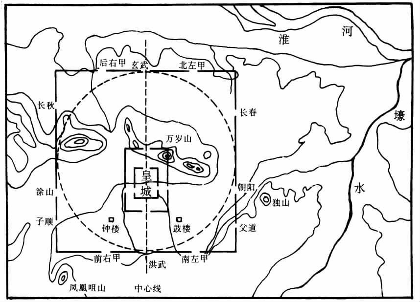 这里“国”指千里京畿。这段话的意思是:古代称王的人,选择天下的正中来建立京畿,选择京畿的正中来建立宫廷;选择宫廷的正中来建立祖庙。从安徽凤阳明中都城的原设计(图2-11)和修改后平面图(图2-12)中,可以明显地体现这种正中思想。