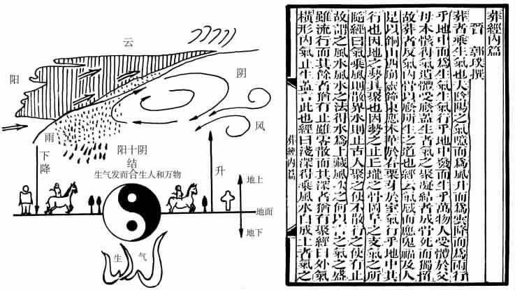 《葬书》认为阴阳二气运行地下则为生气,喷发出去,则为风(图3-19)。风和生气是同种物质(阴阳二气)的两种不同存在状态。因此,当生气露出地面,升入空中,就变为风,如果风被吹散荡尽,就会无法利用,故为了将生气聚止于某地,有必要防止生气荡散。不管怎样,只有环绕吉地的层层山峦才能遮挡住风。这就是吉地之所以通常是为群山所环抱的盆地的原因。所以,从理论上讲,若有风很易吹进吉地,该地就不值得占用了,因为在这种地方甚至连源自吉龙(山脉)的生气都不会为人所用。
