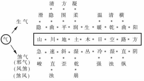 中国古代,认为“气”是万物内在的、流动的本质的体现。对“气”的阴、阳表现作了分类(图3-20)。另外物体还有金银之气、珠玉之气、剑气、唇气……的不同。古人还认为: