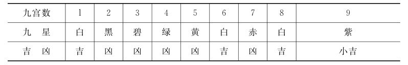 由洛书演变而来的九宫图为堪舆家所利用,把九宫配以九色,九色又叫“九星”,其分别称为:“一白、二黑、三碧、四绿、五黄、六白、七赤、八白、九紫”。依堪舆所定,九星中属于紫白星的为吉,属于黑碧绿黄赤星的为凶(表6-1),即一白、六白、八白、九紫为吉,余为凶,并以此制成九星图(图6—10)。九星图并不是固定不变的,而是依时间逐年变化的,有时还要逐月、逐日、逐时而变化,但总的是以年变化为主,这种变化就叫做“游年”。