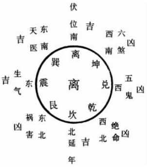 但是,宅卦与命卦的相配仅是个大前提,每个房宅如何布局,还要看宅的吉凶方位如何。堪舆家又依据后天八卦的方位把住宅的平面划分为八个方位。据《易经》“时中”和阴阳平衡的概念,又把住宅的八个方位分为四个吉方和四个凶方,再以宅主命卦与方位相配,得出八个方位中孰方位吉凶与否,并以此为依据来确定建筑的朝向、门的朝向和位置,以及灶、床、厕等的位置,以取得最佳的“气”,生丁旺财,富贵长寿。