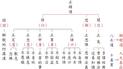你们一般在修好像十善业归十善业,八正道归八正道,事实上这两个要结合,不可以分开,它是从八正道的理念,但是从十善业道下手的修行方法。我们现在从八正道来谈十善业。「正见」,我们早上谈「梁武帝心邪,不识真理。」就是他没有正见。你学佛一刚开始第一个门槛就是正见,你不可以跳过这个门槛。为什么我跟你说「不要急于修行」?你注意看,「闻思修」,所以你不要急于修行,这个东西不懂,你的修行是骗人的,根本修不来,越修越有问题,越修越奇怪,干脆去上班!有些人问我:「师父,我可不可以去道场?」我说:「不用,去上班。」好好上班做个好国民,知道吗?不要来道场捣蛋。假设今天你能够听到一个正见,你只要真正懂,它会输入你的八识田中,生生世世,这个正见会跟着你、不会消失,只要有因缘,这个种子就会现行。正见怎么来的?「闻」。我们今天信不信佛?不信,因为你没有正见,说你信佛是骗人的。如果你真的信佛的话,「诸恶莫作,众善奉行。」你早就做到了。虽然你在诵《地藏王菩萨本愿经》,因果你还是照犯;虽然坏事多少做点,但是经还是要诵。有些人学佛是无可奈何,我看苦就苦在这里,明知道不对还是要做。为什么要做?因为习气嘛!为什么会有习气?因为业障深重嘛!为什么业障深重?因为是凡夫嘛!为什么是凡夫?大家还不都是这样?好啦,就共同入火坑,大家都一样,就不要学啦!你今天思考到最后,是要为你找出一条出路,而不是为你找出一条绝路。要为生命找出口,不要为生命找借口,从这个角度你才愿意去突破。